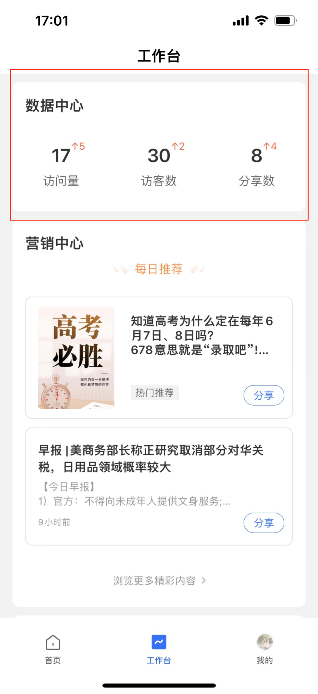 最新版賬多多APP中,工作臺(tái)能清晰看到我們發(fā)出去的素材【訪問量】【訪客量】【分享數(shù)】。