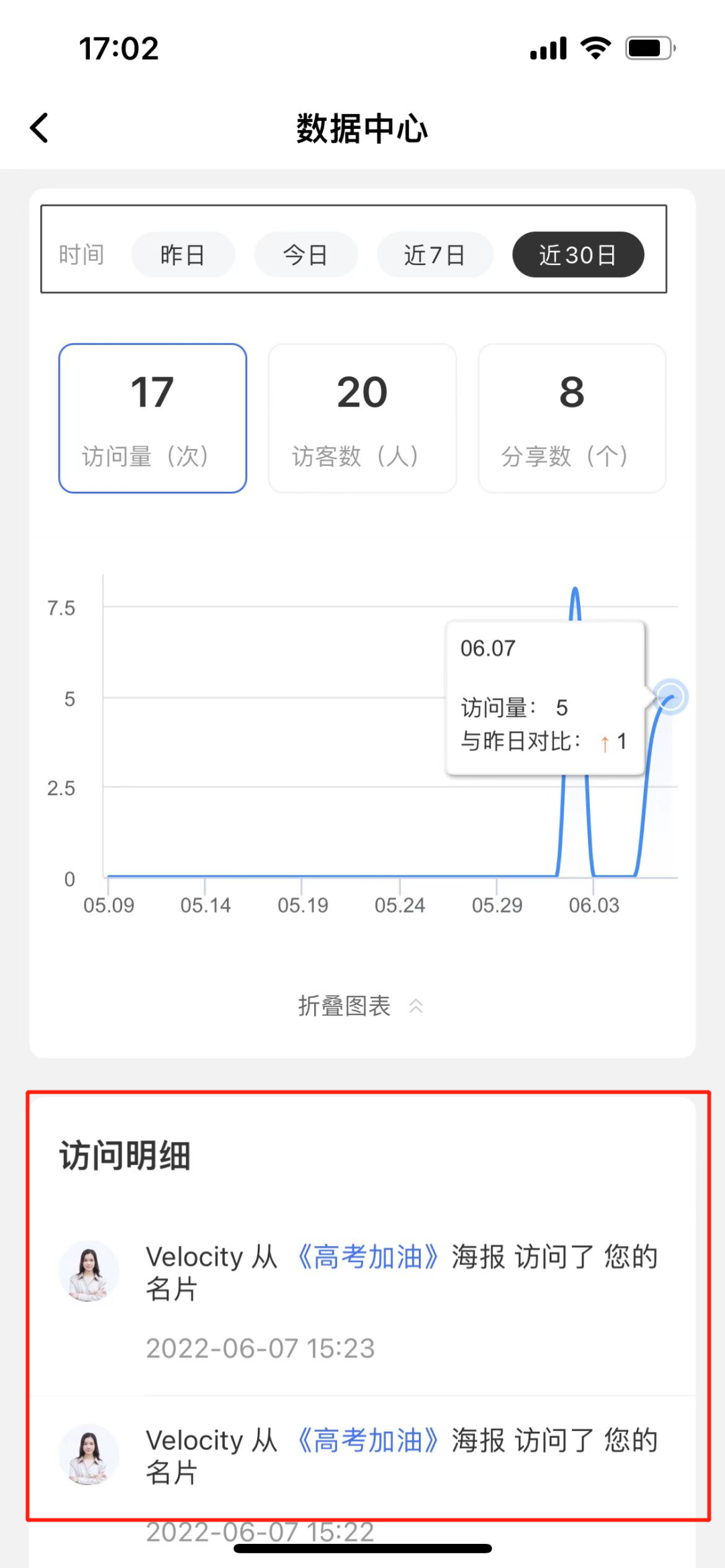 而且數(shù)據(jù)分析更加細(xì)致,可以查看【昨天】【今天】【近7天】【近30天】的數(shù)據(jù),【折線圖】可以直觀查看數(shù)據(jù)變化,【訪問明細(xì)】里還能看到哪個(gè)客戶從哪個(gè)素材訪問了你的名片,清楚客戶的喜好,與客戶聊的時(shí)候也就有了切入的話題點(diǎn)。