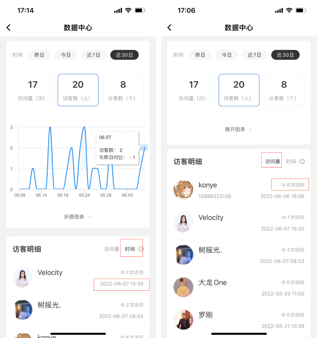 【訪客數(shù)】里可以查看每個(gè)客戶的訪問次數(shù),了解哪些客戶是很關(guān)注你發(fā)布出去的素材。