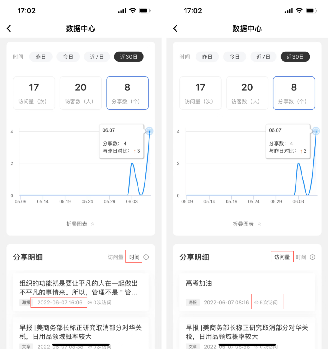 【分享數(shù)】里可以查看分享明細(xì),快速看到已發(fā)出的素材有哪些。