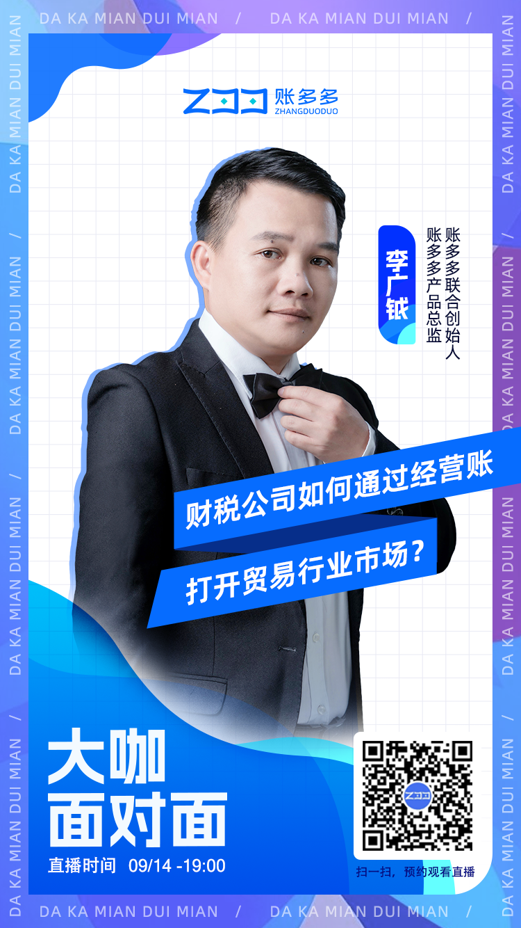 9月14日19點,賬多多聯(lián)合創(chuàng)始人、產(chǎn)品總監(jiān)李廣鉞,12年ERP資深顧問,成功服務中小微企業(yè)超過10000+,他會詳細大家分享財稅公司如何通過賬多多云平臺打開貿(mào)易行業(yè)經(jīng)營賬市場,報價4萬-6萬是如何落地的。